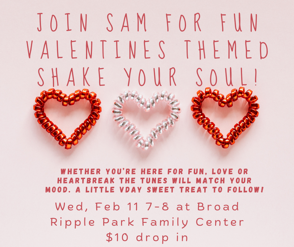 Come celebrate Valentine's Day with Sam this week! Shake Your Soul will be at Broad Ripple Park Family Center Wednesday at 7pm. This body positive, inclusive dance practice encourages you to drop into your own rhythm and connect to yourself and others. There will be an awesome playlist featuring some artists like Dean Martin, Chappell Roan, Taylor Swift, and Erykah Badu. We'll have songs for lovers of love, songs of heartbreak, and as always fun and community!
